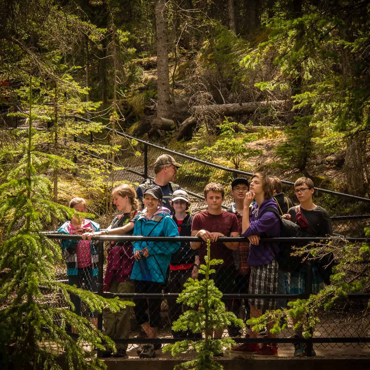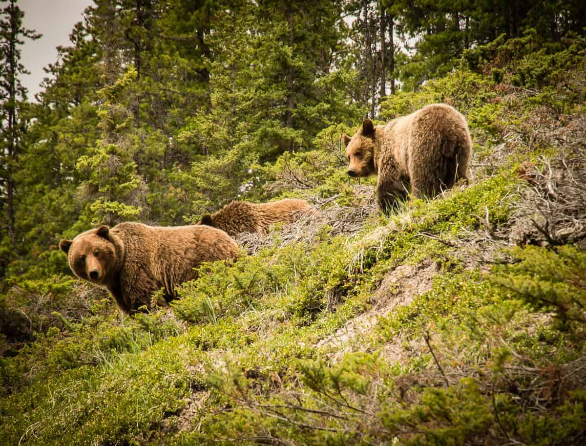 The three bears were about 60 meters away from us, uphill and on the far side of a small stand of trees. Our lead guide, Paula, let us watch them for a few minutes and then instructed us to “make some noise”. With a dozen young teens whooping and hollering, it didn’t take long for the trio of bears to lumber away. To be honest, the rest of our Maligne Canyon walk was a little anticlimactic, even though we saw a crows’ nest with chicks, a tree marked by a bear and peered over the railing of a bridge to the canyon bottom 55 meters below!