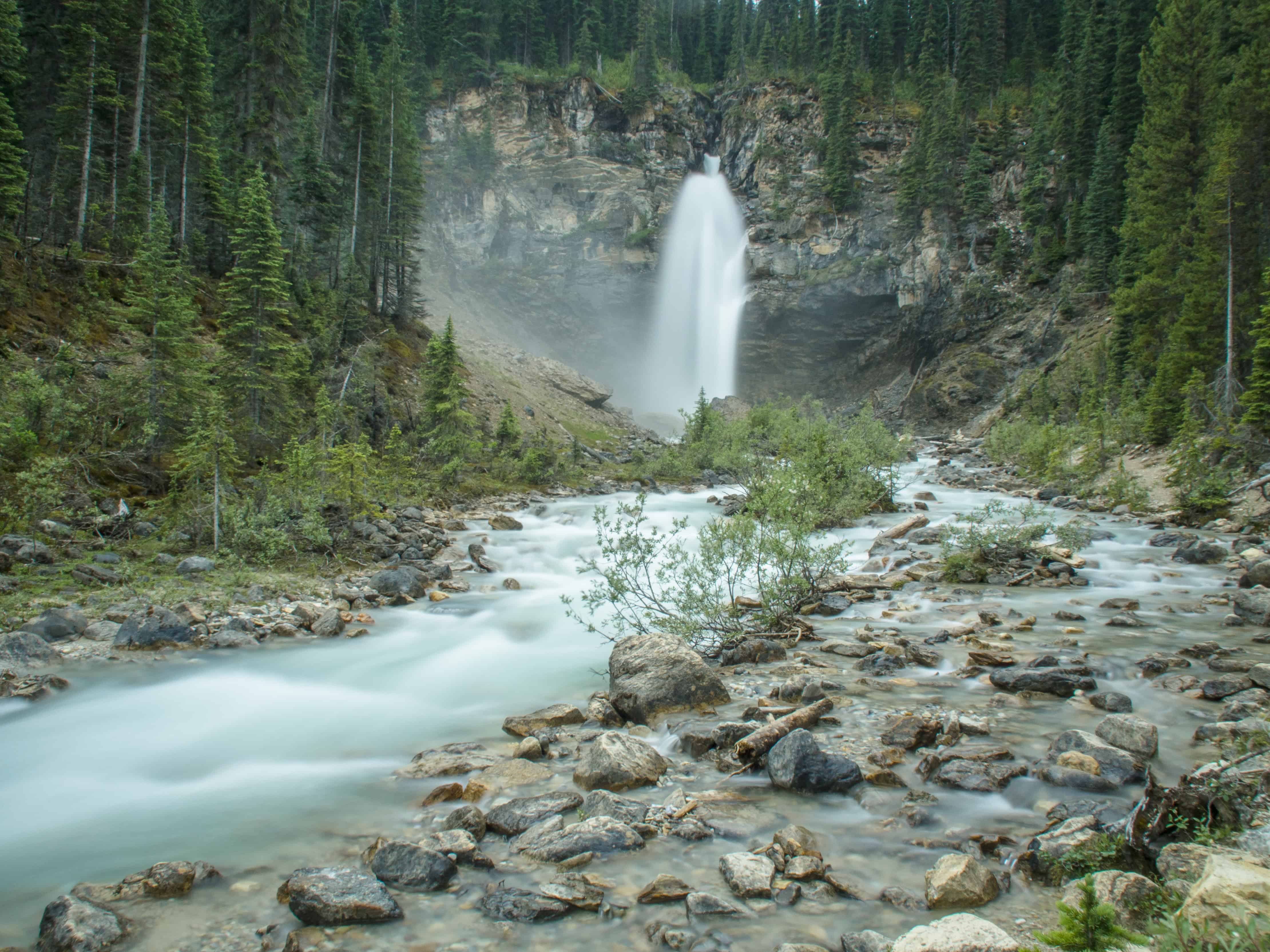 Then, within about 15 more minutes we were on the Little Yoho Valley Trail. It was easy walking through the forest except for a couple of steep spots between the Whaleback Trail intersection and Laughing Falls, where we stopped for some more long-exposure photography.