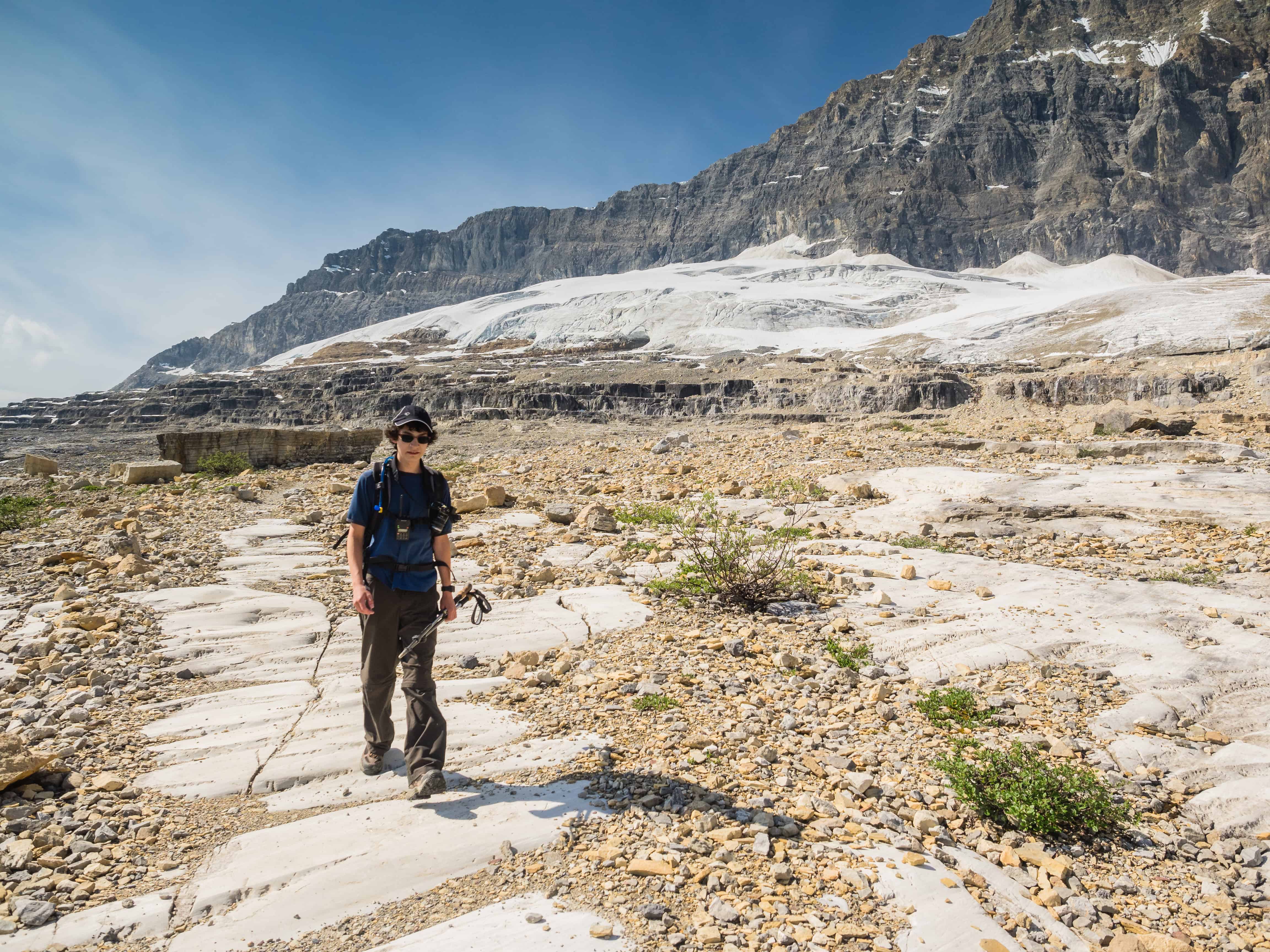 At around 4 km, there’s a switchback that includes a short, steep climb up stone steps. The top of the steps offers the first, impressive view of a long, narrow glacier covering the shoulder of Michael Peak. We spent quite a bit of time here studying the retreating ice and observing signs that the glacier covered the trail here just a hundred years ago: striations, glacial debris and even lines of glacial moraine. If you’re interested in a quick primer on glaciers, please consider Becoming Water by Mike Demuth.