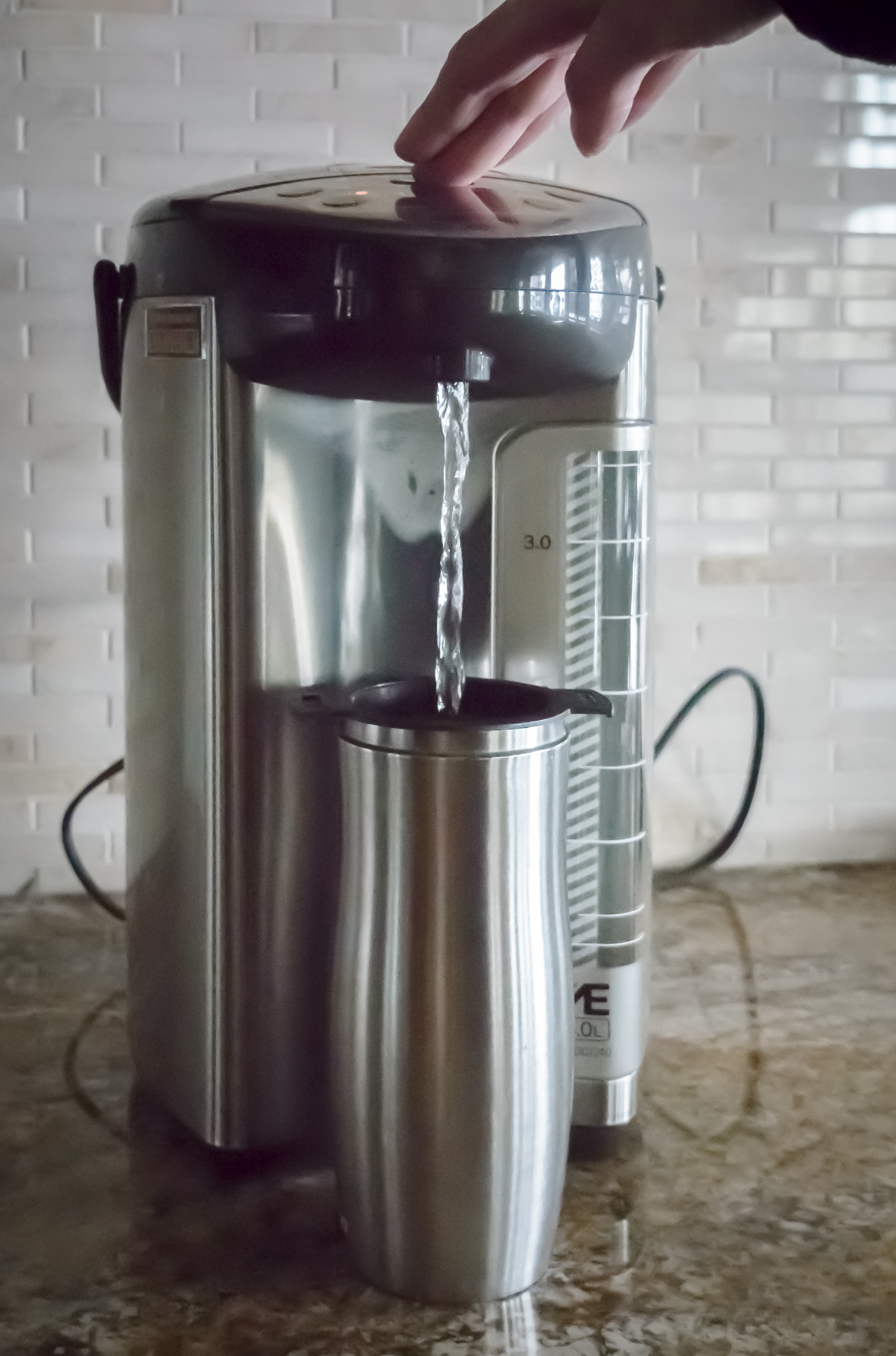 K’s comment on opening the box was “fancy!” And it is. But it’s also intuitive to use. Just fill the vacuum insulated reservoir with fresh water, plug it in, set the desired temperature and wait. Yes, you have to wait. It takes 26 minutes for 3 liters of water to heat to 90C (195F) using the power-efficient default mode and 22 minutes using the quick boil mode. On the flip side, once the water heats to the set temperature, it stays hot all day which means I can brew a cup of tea anytime I want one during the day and K can make another mug of tea after he walks home from school.