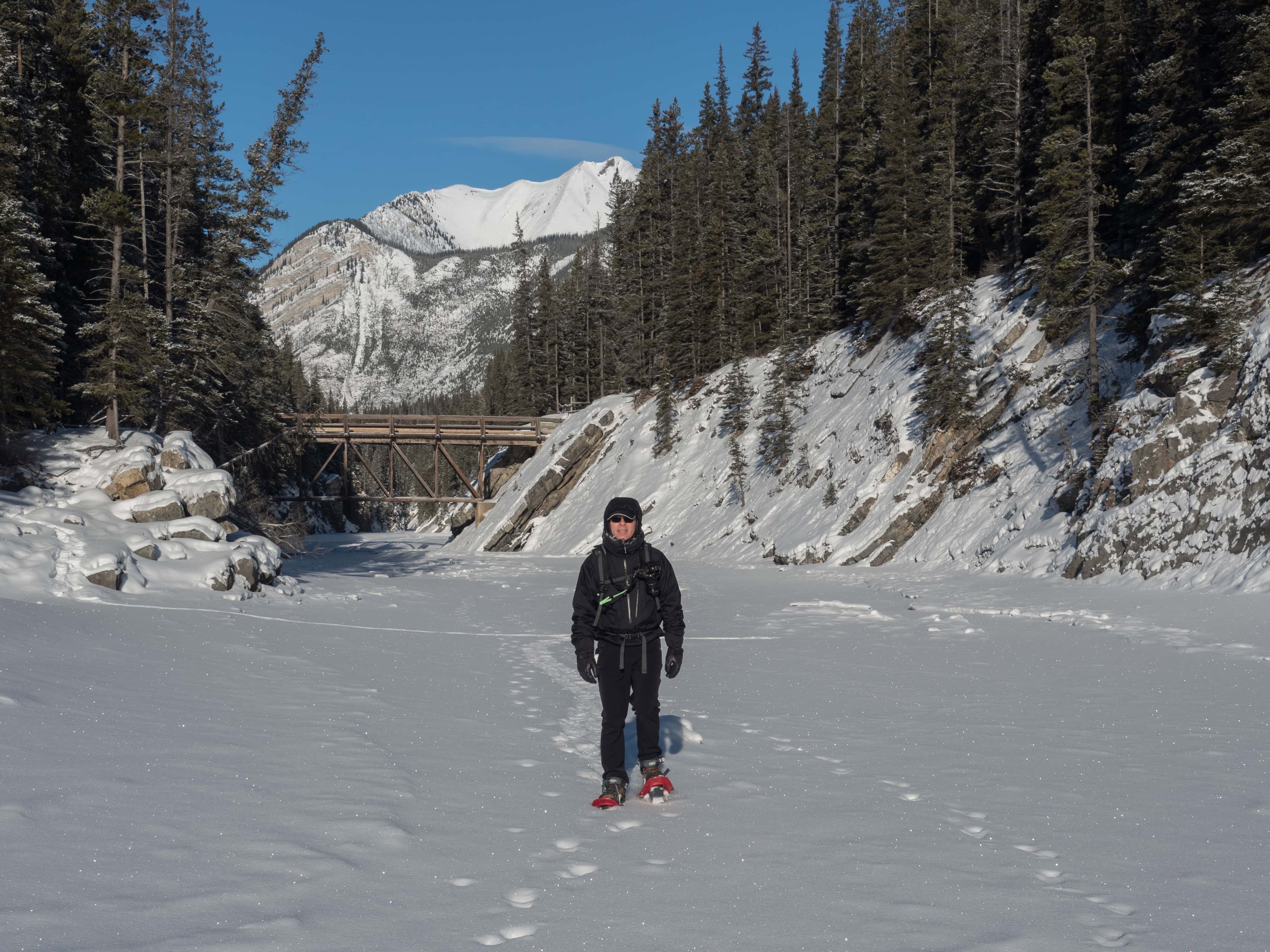 There were just a few vehicles in the parking lot when we arrived at 11 o’clock. It was a lovely day to play outside: blue sky and sunshine with just a light breeze and plenty of snow. We took 30 seconds to strap on our Symbioz Elite snowshoes and headed out along the trail that parallels the Lake Minnewanka shoreline.