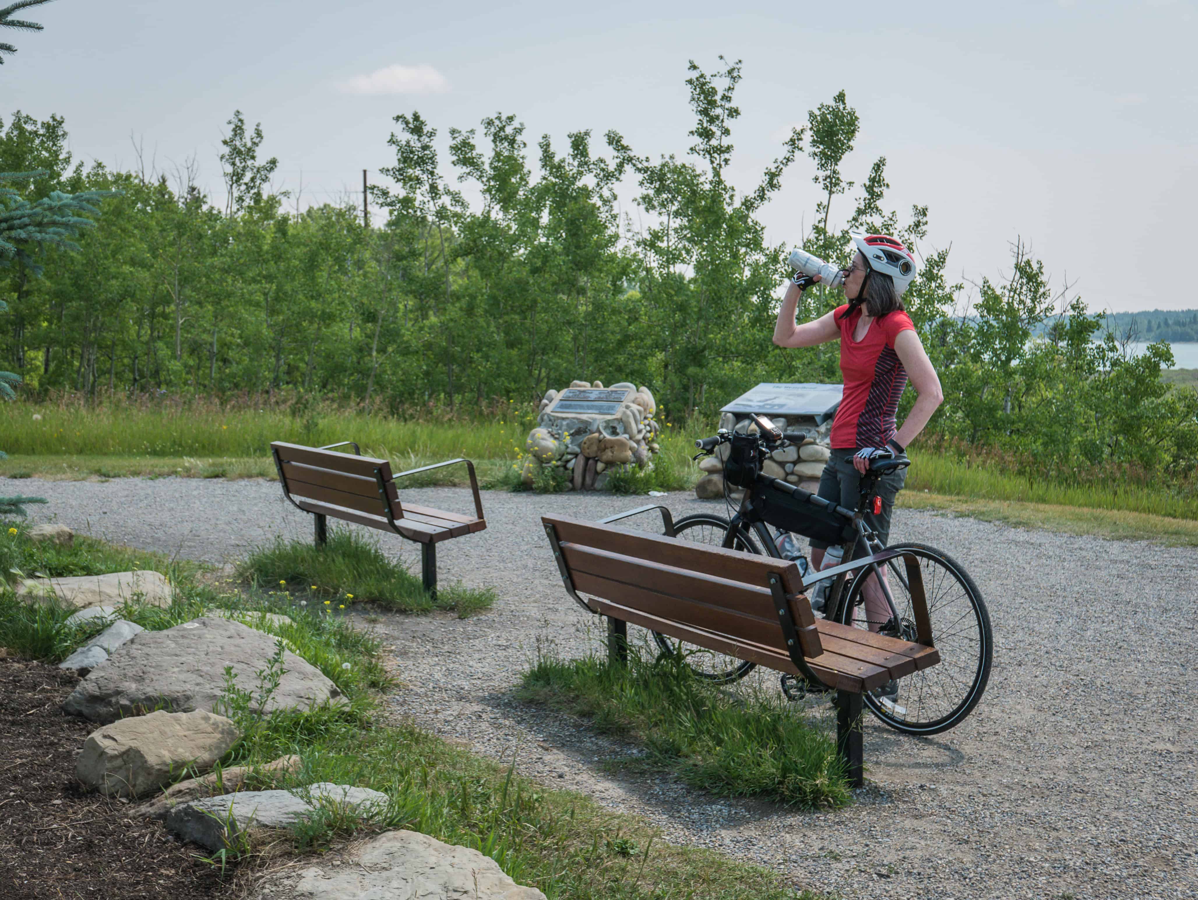 Access: Our route to Ralph Klein Regional Park was via the Bow River Pathway through downtown Calgary, connecting to the Western Irrigation District Canal pathway and then riding east and south along the Greenway. It’s a longish ride (93 km by the time we returned home), plus there’s a stretch near the Shepard Community Hall where the Greenway abruptly ends and you have to ride on the road to cross a rail line in the area. A better option, especially for families, would be to park in Copperfield and ride north. Another (considerably longer) possibility would be to ride from the Fish Creek LRT station.